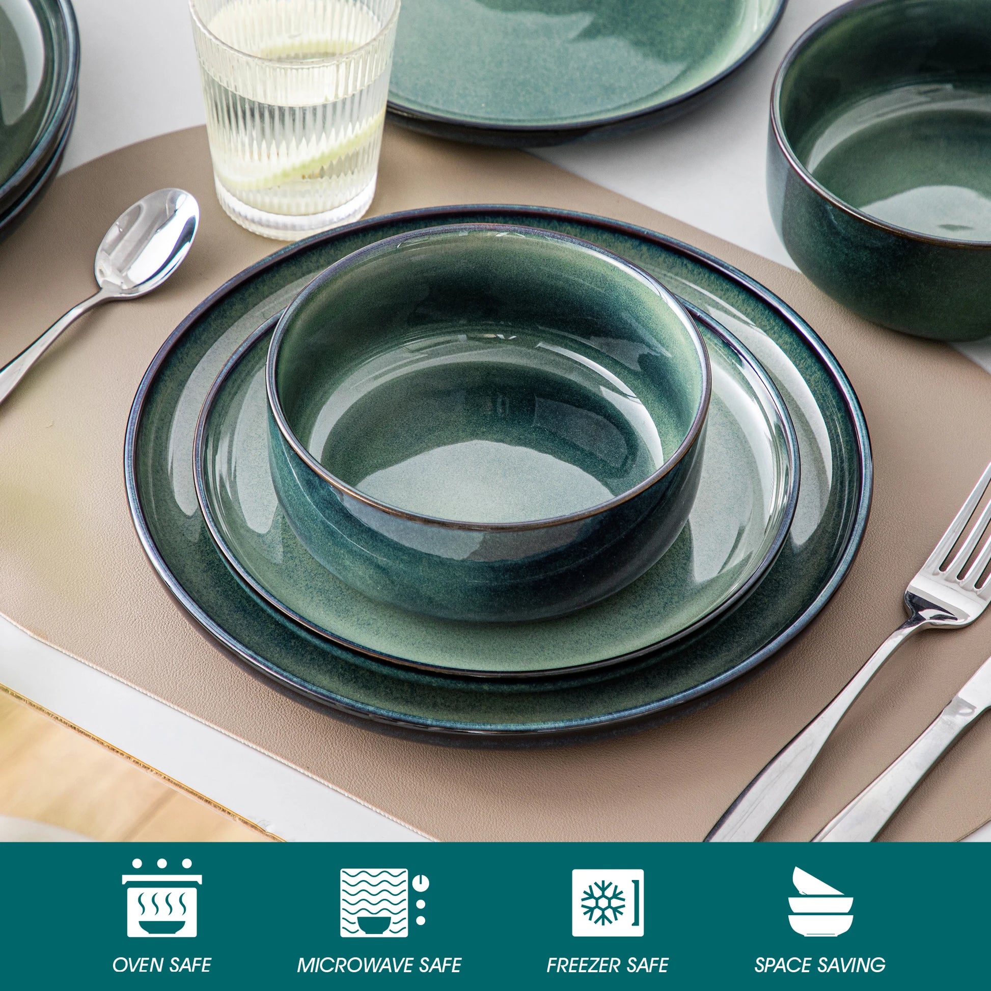 Bringen Sie mühelosen Stil und praktische Funktionalität auf Ihren Tisch. Mit seiner auffälligen grünen Reaktivglasur und dem elegant geschwungenen Rand vereint dieses Geschirrset handwerkliche Ästhetik mit Alltagstauglichkeit – ideal für Haushalte, die Wert auf langlebige Qualität und ein individuelles Design legen.